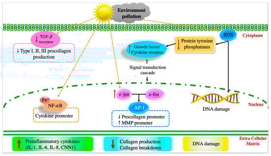 After long-term exposure to external harmful factors (UV irradiation, pollutants, and smoke), ROS radicals are generated on the skin, mediating inflammatory responses that can kill a significant number of skin cells [35]. Generally, ROS radicals downregulate receptor protein tyrosine phosphatases’ (RPTPs) activity, thereby enhancing the expression of phosphorylated receptor tyrosine kinases (RTKs), activating downstream signaling pathways (e.g., transforming growth factor (TGF-β), transcription factor activator protein-1 (AP-1), subsequent nuclear factor-B (NF-κB), and the activation of mitogen-activated protein kinase (MAPK)) [11,37]. Additionally, the external factors upregulate the expression of tumor necrosis factor- (TNF-α), which is important in the pro-inflammatory process, resulting in the inhibition of collagen synthesis and stimulation of matrix metalloproteinase (MMP-9) production [11]. It was also found that long-term exposure to UV radiation can upregulate the expression of other cytokines, such as cysteine-rich protein (CCN1) and interleukins (IL-1, IL-6, and IL-8), which promote aging-related and skin-inflammatory processes [11,38].