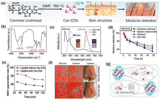 A study developed new carmine cochineal (Car) C-dots with a powerful moisture retention capability [45]. The results showed that Car C-dots absorbed UV irradiation at wavelengths of 213 and 283 nm, which are attributed to π–π* and n–π*, respectively [45]. The photoluminescence spectra showed an emission at 558 nm under UV light excitation 283 nm. The moisture retention capacity of the Car C-dots under high-humidity conditions was equivalent to that of glycerin, which is commonly used as a hygroscopic agent (approximately 78% and 84%, respectively, after 48 h). Human umbilical vein endothelial (HUVEC) cells were more than 80% viable after exposure to Car C-dots at concentrations reaching 300 μg/mL, indicating the low cytotoxicity of Car C-dots. The results also showed that Car C-dots caused low hemolytic toxicity to red blood cells (RBCs), allowing subsequent blood applications. Additionally, the Car C-dots were successfully applied to moisturizing lipsticks (Figure 4) [45]. The moisture retention capacity of a volunteer’s skin was significantly improved after applying Car C-dot-based moisturizing lipstick. C-dots possess a cross-link-enhanced (CE) effect, which enhances the ability of their surface functional groups to bind water molecules during the cross-linking process [45,68]. Furthermore, the surface functional groups of the C-dots exhibited polymer-like properties and could effectively lock water molecules through water absorption and swelling [45,68]. Owing to their unique moisturizing properties due to the combination of polymer swelling and the CE effect, C-dots have significant potential in cosmetics.