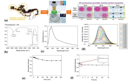 (a) Schematic of the synthesis of C-dots from sea cauliflower and their UV protection capabilities; (b) FT-IR spectra of C-dots; (c) UV-Vis absorption spectra of C-dots; (d) photoluminescent emission spectra in the range of wavelength from 250 nm to 550 nm; (e) photostability of C-dots solution under UV irradiation for 360 nm; and (f) photostability of C-dots solution under UV irradiation for 37 h 1.4 years after the initial synthesis. Copyright permission from reference [60].