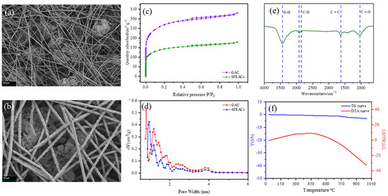 SEM images of SFEACs (a,b); N2 adsorption–desorption isotherms of the SFEACs and GAC (c). Pore size distribution of GAC and SFEACs (d); FTIR spectra of the SFEACs (e); TG and DTA curves of SFEACs (f).