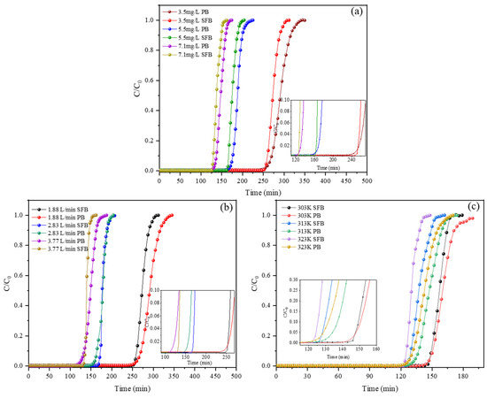 Under different adsorption conditions, the breakthrough curves of SFB and PB on DMMP vapor are shown in Figure 3. The results show that SFB has a lower DMMP adsorption capacity than PB, and the increase in the breakthrough time (tb) can reach 13.8%. This is because the particle size of activated carbon in SFEACs (125–150 μm) is seven times smaller than that of GAC in PB (0.9 mm), so the SFEACs have less particle diffusion resistance and higher adsorption efficiency. In addition, due to the high porosity of SFEACs itself, the gas-solid contact efficiency is relatively high compared with PB, and the low concentration of DMMP at the outlet of the fixed bed can be quickly adsorbed to prolong the breakthrough time. When the activated carbon adsorbed in SFEACs reaches the saturated adsorption amount, the breakthrough concentration will increase rapidly, so the breakthrough curve of SFB is steeper than that of PB, indicating a higher adsorption rate and higher adsorbent utilization.