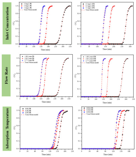 In addition, the We value of the composite bed is basically stable with the increase in flow rate. The We value decreases with the increase in adsorption temperature, which is consistent with the results of thermodynamic analysis. The We value increases with the increase in the inlet concentration [34].