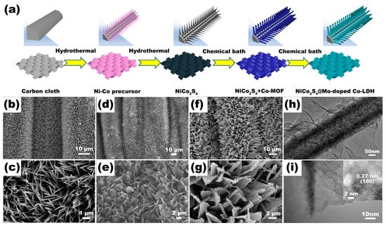 (a) Synthesis process of the NiCo2S4@Mo-doped Co-LDH. Low- and high-resolution SEM images of the (b,c) NiCo2S4, (d,e) NiCo2S4@Co-MOF, (f,g) NiCo2S4@Mo-doped Co-LDH. (h,i) Low- and high-resolution TEM images of the NiCo2S4@Mo-doped Co-LDH.