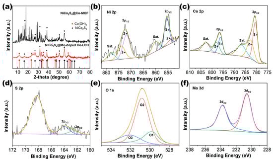 (a) XRD patterns of the NiCo2S4@Co-MOF and the NiCo2S4@Mo-doped Co-LDH. XPS spectra of the NiCo2S4@Mo-doped Co-LDH in the (b) Ni 2p, (c) Co 2p, (d) S 2p, (e) O 1s, and (f) Mo 3d regions.