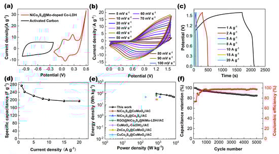 (a) CV curves of the AC and the NiCo2S4@Mo-doped Co-LDH electrodes. (b) CV and (c) GCD curves of the NiCo2S4@Mo-doped Co-LDH//AC ASC at various scan rate and current densities. (d) Rate capability of the ASC device. (e) Ragone plot of the ASC device. (f) Cycling stability of the supercapacitor device at 10 A g−1.