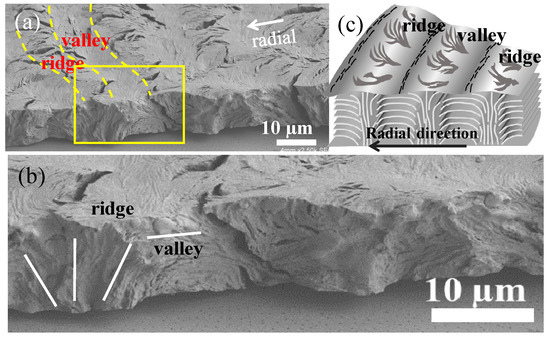 Solvent etching was necessary to expose the interior assembly. The PPDO/PVA (95/5) specimens were etched using p-dioxane prior to SEM interior analysis. At ambient temperatures, PVA rapidly dissolves in p-dioxane; by contrast, PPDO needs to be heated to dissolve in the same solvent. Thus, the differential solubility of these two polymers in p-dioxane has made it ideal for etching PVA from crystallized PPDO/PVA spherulites. Specimens were pre-etched and then characterized using SEM, the results of which are shown in Figure 2. The interfaces between the spokes became more apparent, with fibril lamellae clearly exposed (Figure 2a,b). Figure 3c shows a zoomed-in image of the red-squared zone in Figure 3b, where the ring bands are composed of cyclically alternate circumferential-oriented flat-on plates and radial-oriented edge-on crystal plates that bend and scroll in the clockwise direction to eventually merge into the circumferential-oriented flat-on plates. The thickness of these edge-on crystal plates is estimated to be ca. a few hundred nanometers, with a length of ~5–10 µm (i.e., equal to the inter-band spacing). Cycles repeat in the same manner to build successive bands in each of the spokes. Obviously, the growth is in a cycle and not continuous, unlike a screw helix radiating out from a common nucleus center. Instead, discontinuity between successive bands is obvious. Furthermore, the bands discretely self-assemble in each of the radial-oriented spokes (cactus-like arms), that is, they are not circularly smooth around a common nucleus.