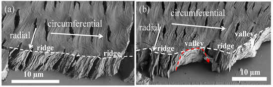 Circumferential-fractured interiors of the banded PPDO were then analyzed. Figure 6 shows SEM micrographs fractured along the circumferential direction of a specific banded PPDO. In principle, along the circumferential direction, fracturing can statistically cut all on ridge zones (Figure 6a), or alternatively on a ridge-to-valley zone (Figure 6b). In Figure 6a, one can see that if the fracture line is only on the ridges, the exposed interior lamellae are all normal-oriented (normal to the substrate). By contrast, if the fracture line covers both the ridge and valley zones, the interior lamellae underneath a ridge are still normal-oriented; yet, if across a valley zone, the lamellae underneath the valley zone are obviously horizontal-oriented. The fracture line in Figure 6b is drawn successively across two ridge zones and two valley zones; consistently, the alternate interior lamellae orientations are correlated well with the top surface ridge and valley. The interior dissection results of the periodically banded PPDO clearly do not support the conventional notion that the interior lamellae undergo a continuous helix twist to form optical bands in POM, as proposed in decades of classical investigations.