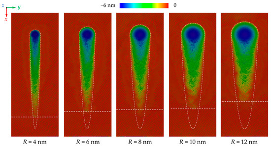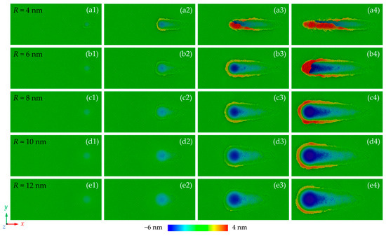 Furthermore, to understand the deformation mechanism in subsurface workpiece during nano-grinding, the atomic displacement magnitudes of workpiece atoms with different grain sizes are calculated, as illustrated in Figure 5a. When elastic deformation occurs, the workpiece atoms deviate from their balance position and the displacement magnitude of their neighbors would vary continuously. During plastic deformation, the crystal structure is destructed and an obvious discontinuous distribution of the displacement magnitude can be observed. It is found that in the initial grinding stage, the friction between the workpiece and abrasive grain could induce irregular destruction of the crystal structure near the workpiece surface. As grinding depth increases, the plastic deformation zone is gradually enlarged and obvious dislocation paths along the <101> directions are observed in the subsurface workpiece. When the grain size increases, both the elastic and plastic deformation zone is apparently enlarged, causing greater displacement of workpiece atoms, as shown in Figure 5b. Although the contact region between the workpiece and abrasive grain is enlarged, the friction-induced damage becomes less apparent when a larger grain is adopted. More dislocation paths are observed as the grain size increases due to the stronger interaction between abrasive grain and workpiece subsurface, as shown in Figure 5a.