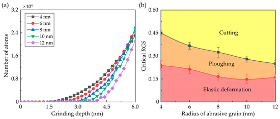 Variation of the atoms in chips and ridges as a function of grinding depth is present in Figure 4a. In the initial stage, more atoms are piled up on the uncut surface with a small grain size since the material removal mechanism transition occurs at a smaller grinding depth. On the other hand, due to the larger contact area between the workpiece and abrasive grain, the atoms in chips and ridges rise at a faster rate with larger grain sizes. It is observed that when the grinding depth reaches 6 nm, most atoms are piled up to the uncut surface as the radius of the grains is set as 8 nm. In nanometric cutting, the critical depth for the transition of the material removal mechanism is greatly determined by the geometric relationship between the depth of cut and tool edge radius, which can be measured by the relative tool sharpness (RTS) [48,49]. In this research, the ratio of the transient grinding depth and grain radius is defined as the relative grain sharpness (RGS) to describe the geometric relationship between grinding depth and grain size. Figure 4b shows the variation of the critical RGS for grinding mechanism transition as a function of grain size, which is determined based on the surface morphology in Figure 3 and piling-up atoms in Figure 4a. With an increase in grinding depth, the dominant grinding mechanism experiences the transition from elastic deformation to ploughing and then cutting. It is observed that critical RGS for the transition from elastic deformation to ploughing decreases from 0.23 to 0.16 with an increase in grain size. By contrast, the transition from ploughing to cutting can be affected more apparently by increasing the grain size. As the grain radius increases from 4 nm to 12 nm, the critical RGS for ploughing to cutting transition decreases from 0.45 to 0.25. It is worth mentioning that in previous research on nanometric cutting, the critical RTS for the transition of material removal mechanism is nearly constant for certain materials and cutting directions [48]. This difference can be attributed to the three-dimensional model adopted in this simulation. Compared to two-dimensional models, the MD model in this simulation could describe the three-dimensional structure evolution and atomic flow along the y direction more accurately [50], which is an important phenomenon in the formation of ridges and affects the atomic strain and internal stress near the contact region in the workpiece.