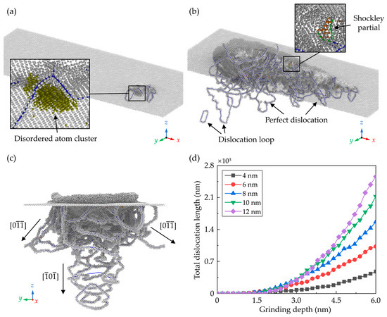 Snapshots of the crystal defects in subsurface at grinding depths of (a) 2 nm and (b) 6 nm. (c) Front view of the crystal defects in subsurface at grinding depth of 6 nm. (d) The total length of dislocations during nano-grinding.