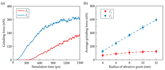 Variation of the grinding forces. (a) The transient grinding forces where the grain radius is 6 nm. (b) Average grinding forces with different grain sizes (Averaged from three simulation cases).