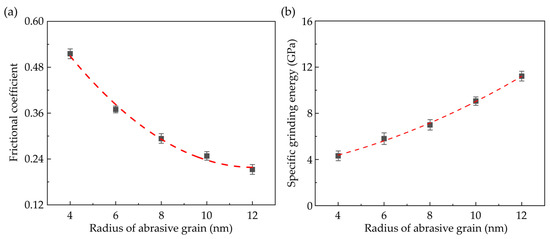 (3) During the nano-grinding process, the grinding forces rise when the grain radius increases, especially for the normal force. Due to the variation of the dominant grinding mechanism, the average frictional coefficient is decreased when the grain size is enlarged. Meanwhile, an increase in specific grinding energy with increasing grain size is observed, indicating a lower grinding efficiency and, thus, a less energy-efficient grindability when grains with larger size is adopted.