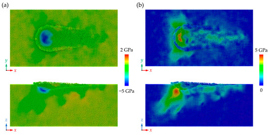 During nano-grinding, the strong interaction between the workpiece and abrasive grain could lead to an increase in the stress in the deformation region, which has a great influence on the grinding process and damage formation. The hydrostatic stress and von Mises stress can be calculated via the three-dimensional stress tensors in LAMMPS [53]: