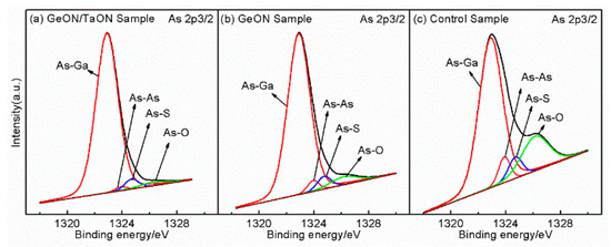 The high Dit observed on the GaAs surface can primarily be attributed to the presence of native oxides of Ga and As. Additionally, another potential source of Dit is arsenic, which can exist in the form of dimers or as elemental arsenic. Arsenic dimers are commonly found in various surface reconstructions of GaAs, whereas elemental arsenic may result from preferential oxidation of Ga and the instability of As2O3 on the GaAs surface, as described by the chemical reaction [10]: As2O3 + 2GaAs → 4As + Ga2O3. The As 2p3/2 and Ga 3d spectra of the samples are shown in Figure 7 and Figure 8, respectively, where the As-S, Ga-S, and Ga-N peaks can be found due to the sulfur passivation by the (NH4)2S dipping and the nitridation induced by sputtering in an N2-contained ambient. In Figure 7, an As-O peak can be found at 1326.2 eV for the three samples, and in Figure 8, all three samples exhibit a Ga-O peak at 21.1 eV, indicating the oxidation of the GaAs surface. As compared to the control sample, the As/Ga-O peaks and the As-As peaks are weakened for the GeON sample and especially for TaON/GeON sample, implying that the formation of low-k native oxides on the GaAs surface and arsenic dimers is effectively suppressed by GeON IPL, especially by the dual IPL of TaON/GeON, due to its strong blocking role against O in-diffusion toward the GaAs substrate and the reduced reaction between Zr and Ge in the gate stack. The strong As/Ga-O peaks and As-As peaks of the control sample in its As 2p3/2 and Ga 3d spectra (Figure 7c and Figure 8c) indicate a large amount of low-k Ga/As-oxides and arsenic dimers on the GaAs surface, leading to a much smaller accumulation capacitance in Figure 2 and a high Dit. In addition, the weakest As-As peak is also observed in Figure 7 for the TaON/GeON sample, suggesting the suppressed formation of the As-As bonds on the GaAs surface. It is well known that the Ga/As-O and As-As bonds are closely related to the defects at/near the surface, and so it can be concluded that the use of the TaON/GeON dual IPL can effectively reduce the defects at/near the GaAs surface, thus leading to much improved electrical properties of the devices, as described above.