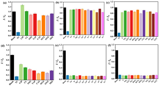 Fluorescence intensities at 465 nm of NCDs@(4-Hap)4(Mo8O26) in different (a) antibiotics (100 µM), (b) metal ions (100 µM) and (c) anions (100 µM) in aqueous solutions; fluorescence intensities of NCDs@(4-Hap)4(Mo8O26) (Ex = 380 nm) at 465 nm with the coexistence of TC (100 µM) and different (d) antibiotics (100 µM), (e) metal ions (100 µM) and (f) anions (100 µM) in aqueous solutions.