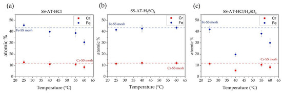 A different behavior than HCl is observed after 15 min of H2SO4 etching (Figure 6b): Fe at.% and Cr at.% are similar in the whole temperature range considered (RT–60 °C), and they do not vary with respect to the SS-pristine mesh. These data can be reasonably interpreted considering the complexity of corrosion processes in concentrated H2SO4 solutions. Rouzmeh et al. [30] found that H2SO4 at pH 1.5 causes the formation of a thick layer of iron oxo-hydroxide species at the surface of mild steel, originating from the deposition of corrosion products because the solution behaves as a strong acid able to protonate the iron oxides present on the surface [31]. Similarly, Cr at.% is expected to be comparable to the SS-pristine mesh because of the oxidative passivation occurring at high H2SO4 concentrations, leading to the deposition of Cr oxide/oxo-hydroxide layers, as observed by Stypula et al. [32] for Cr corrosion in H2SO4. Furthermore, in the review published by Panossian et al. [33], it was observed that at H2SO4 concentrations greater than 9M, the corrosion rate of several types of steel tends to be low. All these observations agree with the constant trend observed for Cr at.% and Fe at. %. This behavior justifies what was evidenced in previously shown SEM images (Figure 2d–f, Figure 3d–f and Figure 4e); the surface corrosion of the SS-AT-H2SO4 mesh is significantly lower than that of SS-AT-HCl and SS-AT-HCl/H2SO4 at the same temperature and for the same treatment time.
