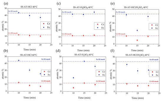 The treatment at 40 °C with HCl/H2SO4 (Figure 7e) shows a probable prevailing corrosive effect induced by the HCl acid at up to 15 min of treatment, with a reduction in metals’ at.%. However, after this period, the competitive passivating effect of H2SO4 starts the surface oxidation of the SS mesh. At 60 °C (Figure 7f), the HCl corrosion is the predominant contributor, also reinforced by the H2SO4 presence (see micrographs reported in Figure 4).