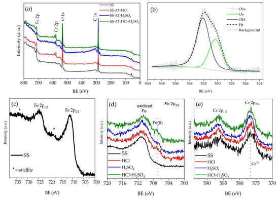 For the completeness of analyses and to better understand the surface processes induced by the different etching solutions, XPS analyses (Figure 8) are carried out on SS pristine net and etched SS meshes, after immersion in the three acid solutions, for 15 min at 55 °C. As shown in the extended surveys (Figure 8a), the main elements identified are C, O, Cr, and Fe. Generally, no elements such as Cl and S (resulting from the acid baths) are evident. High-resolution measurements were collected for the photoemission peaks C 1s, O 1s, Cr 2p, and Fe 2p. Table S3 (Supplementary Materials) reports the atomic percentages of these elements in the four analyzed samples.