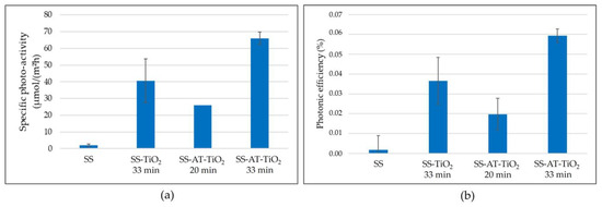 (a) Specific photoactivity for the SS, SS-TiO2, and SS-AT-TiO2 meshes; (b) Photonic efficiency for the SS, SS-TiO2, and SS-AT-TiO2 meshes.