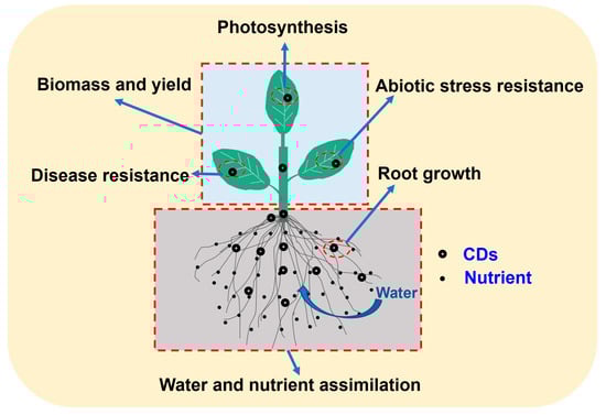 The absorption of water by crops is accompanied by the absorption of nutrients. Hydroxyl and carboxyl groups also endow CDs with the ability to adsorb various nutrient ions (K+, Ca2+, Mg2+, Cu2+, Zn2+, Mn2+, and Fe3+), which are important nutrient elements for crop growth. They interact with hydrophilic groups on the surface of CDs through hydrogen bonding and electrostatic interactions, and adsorb on the surface of CDs; when CDs enter the plant, the concentration of nutrient ions increases with CDs in the plant, and this is also the reason for the sustained and slow release of nutrients from the xylem [55]. The nutrient ion content in arabidopsis treated with CDs is higher than that in a control, indicating that nutrient ions can enter the plant with CDs [46]. Studies on coriander showed that spraying 40 mg L−1 of CDs increased the content of K, Ca, Mg, P, Mn, and Fe by 64.3%, 21.0%, 26.2%, 12.8%, 56.0%, and 125%, respectively [56]. When 0.02 mg mL−1 of CDs was used to treat lettuce, the N, P, and K contents of the plants increased by 4.4%, 10.8%, and 16.5%, respectively [57]. On the other hand, after treating them with CDs, the expression of genes related to aquaporins (membrane proteins used for transporting water, nutrients, and gases) is upregulated, thereby increasing water and mineral ion absorption and promoting crop growth [58,59]. Carbon is widely present in soil, and CDs are more environmentally friendly than general nanomaterials are. The CDs entering the soil increase the EC value of soil. The increase in EC value is the direct reason for the formation of a large amount of bicarbonate ions in soil, promoting the absorption and utilization of water and nutrients, such as nitrogen, phosphorus, and potassium, via crop roots [60]. In addition, CDs can improve the activity of nitrogenase and the nitrogen fixation efficiency of nitrogen-fixing bacteria by affecting the secondary structure of nitrogenase and improving electron transfer in the biocatalytic process. This provides an economic and environmentally friendly way to improve the biological nitrogen fixation ability of nitrogen-fixing bacteria and provide a nitrogen source for crop growth when nitrogen is insufficient [2,37].
