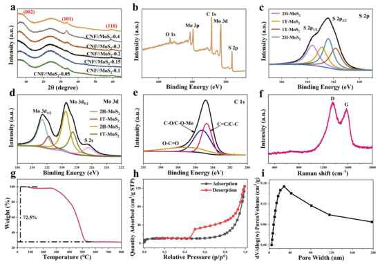 (a) XRD patterns of these sample, and (b) XPS full survey and high-resolution XPS spectra of (c) S2p, (d) Mo3d, (e) C1s for CNF//MoS20.3, (f) Raman spectra, (g) TGA curve, (h) the N2 sorption isotherms and (i) pore-size distribution curve of CNF//MoS20.3.