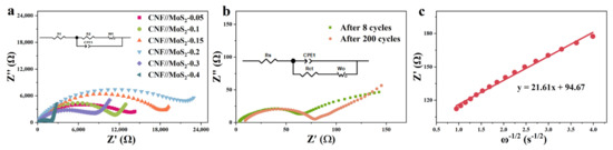 (a) Nyquist plots of these prepared samples, (b) Nyquist plots of CNF//MoS2-0.3 after 8 and after 200 cycles charge–discharge cyclesand (c) the relationship between Z’ and ω−1/2 in the low-frequency region after 200 cycles.