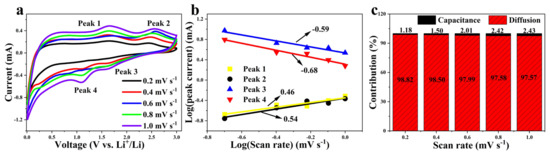 In order to further explore the kinetic behavior of CNF//MoS2-0.3 as an anode for LIBs, the CV curves at different scan rates in the range 0.2~1.0 mV s−1 have been recorded. As shown in Figure 8, the pseudocapacitance contribution can be calculated according to the relationship between current (i) and scan rate (ν) [49,50].