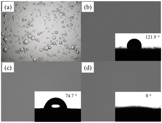 Oil–water separation effect of different samples: (a) original oil–water emulsion; (b) v-W@CDs@PVA; (c) v-DLW@CDs@PVA; (d) v-TPDLW@CDs@PVA. The internal illustrations show the water contact angle of the corresponding wood structure in the air.