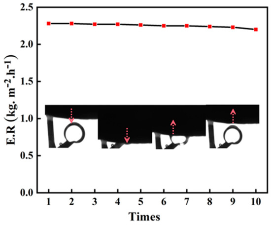 In order to assess the durability of v-TPDLW@CDs@PVA, ten cycles of solar-driven oil–water separation experiments were conducted. The variations in water evaporation rates during this process were investigated, and the experimental results are shown in Figure 6. Following the completion of each testing cycle, the samples were cleaned with distilled water to prepare for subsequent oil–water separation experiments. Through ten cycles of testing, the water evaporation rate of v-TPDLW@CDs@PVA only exhibited a marginal decrease of 0.01 kg m−2 h−1, indicating remarkable durability. This suggests that v-TPDLW@CDs@PVA consistently maintains its effectiveness in efficiently separating water from oil–water emulsions over extended durations. Furthermore, after ten consecutive cycles of experimentation, an underwater oil contact angle assessment was performed on v-TPDLW@CDs@PVA. The specific experimental procedure involved placing an oil droplet in water, then gradually lowering the sample until complete contact was achieved between the sample and the oil droplet. Subsequently, the sample was slowly raised to achieve complete separation from the oil droplet. The changes in the oil contact angle are illustrated in the inset of Figure 6. After ten cycles of experimentation, v-TPDLW@CDs@PVA continued to exhibit robust underwater oleophobicity, validating its reliability over prolonged periods of oil–water separation processes.