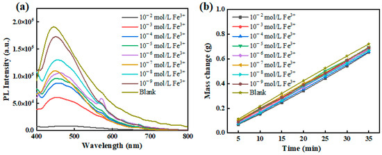 v-TPDLW@CDs@PVA at different concentrations of Fe3+: (a) fluorescence spectrum, (b) water evaporation rate.