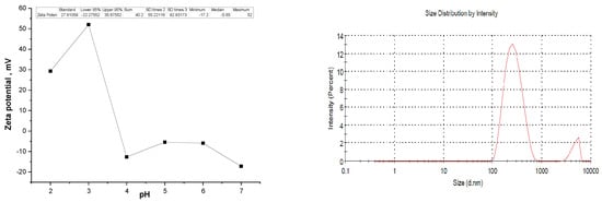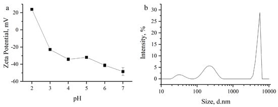 A detailed characterization of A. platensis is provided in [29]. In Figure 1, the particle size distribution (Figure 1a) and zeta potential (Figure 1b) of spirulina biomass at different pH values are presented. At pH 2, the zeta potential was positive at 23.3 mV, suggesting a positive charge of the spirulina biomass surface. At pH ranges of 3–6, the values of the zeta potentials were negative, varying from −22.2 to −45.2 mV, indicating the negative charge of the biomass surface. The size of the main part of the biomass particles was in the range of 90–300 nm and 3.5–5.5 µm.