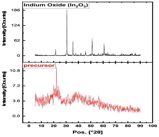 The following supporting information can be downloaded at: https://www.mdpi.com/article/10.3390/nano13192698/s1, Figure S1: D-spacing analysis of indium oxide nanoparticles attached to reference card (01-089-4595); Figure S2: Comparative peak list (2θ) of synthesized In2O3-NPs (orange color) related to standard In2O3 reference card (01-089-4595) (blue color); Table S1: D-spacing analysis of indium oxide nanoparticles. Figure S3. Comparative peak list (2θ) of synthesized precursor (orange color) related to standard different references cards. Supplementary File S1: the raw data of zeta potential measurements.