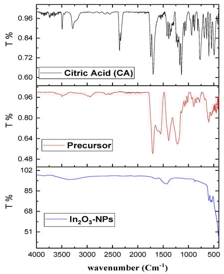 FT-IR spectra of citric acid as ligand, precursor, and In2O3-NPs.