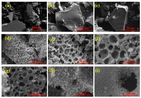 SEM images of (a–c) precursor crystallite clusters (d–i) In2O3 NPs at different magnifications.