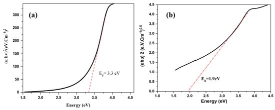 Tauc plot for indium oxide nanoparticles’ (a) direct band gap energy Eg and (b) indirect band gap energy (Eg).