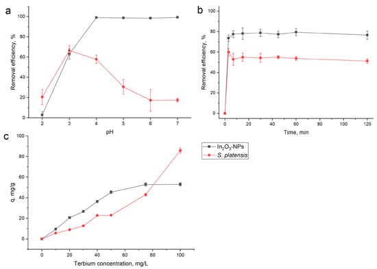Due to its influence on the chemical speciation of the metal ions in the solution and the ionization of functional groups on the adsorbent surface, the pH is a crucial factor in the adsorption process [54]. To assess the effect of the pH on terbium ion removal, experiments were performed at pH values in the range of 2.0–7.0. At pH 2.0, for both adsorbents, the efficiency of terbium ions removal was low: 2.8% for In2O3-NPs and 20.5% for spirulina biomass (Figure 7a). Low adsorption can be explained by the competition of hydrogen ions with terbium ions for binding sites on the surface of adsorbents [55]. An increase in the pH facilitated terbium ion removal, and in the case of In2O3-NPs at a pH range of 4.0–7.0, removal efficiency reached 98–99%. The high efficiency of terbium removal at the mentioned pH values can be associated with its ions binding to OH groups. Following the addition of OH groups to the solution (in the present study due to use of NaOH), cationic [Tb(OH)(H2O)7]2+, [Tb(OH)2(H2O)6]+, and neutral [Tb(OH)3(H2O)5] hydroxo complexes can be formed. Thus, it can be suggested that In2O3-NPs adsorb terbium that is present in the solution as cationic or neutral hydroxo complexes [56]. It has previously been reported that hydrolyzed cationic and even neutral complexes of REEs are priority species for sorption on zeolites and linoptilolites [56]. In the case of spirulina biomass, a maximum terbium removal of 66% was attained at pH 3.0, when the biomass surface became negatively charged (Figure 1), leading to an enhanced adsorption. The obtained results are in line with other research studying the adsorption of REEs onto spirulina biomass [57]. A further increase in the pH values resulted firstly in the slight decrease in the terbium removal at pH 4.0 (57%), and then, it was significantly reduced and at pH 6.0–7.0 amounted only to 17%. Terbium, as other REEs, exists in the form Tb3+ at pH < 4.0, while at higher pH values, their species including Tb(OH)2+ and Tb(OH)3 are formed [58]. The decrease in terbium removal at pH > 4 can be associated with the increase in the hydroxide ligands due to the use of NaOH for the adjustment of pH, which resulted in the formation of terbium species for which spirulina biomass possesses a low adsorption capacity. Thus, it can be suggested that different mechanisms are involved in terbium adsorption for the two studied adsorbents.