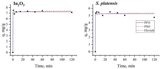 The effect of contact time on removal was studied in order to define the equilibrium point at which the maximum adsorption capacity could be achieved and to explain the kinetics of the process [62]. The influence of the time on the removal of terbium ions is illustrated in Figure 7b. For both adsorbents, the removal efficiency sharply increased in the first 3 min of sorbent interaction with the sorbate, reaching 74% removal for In2O3-NPs and 60% for spirulina biomass. The fast adsorption in the first minute of interaction becomes almost insignificant in the next 120 min of reaction, and so, equilibrium was attained in a very short time, a fact that is very important for the industrial applications of adsorbents. The enhanced sorption of terbium in the rapid phase of interaction can be explained by the availability of a large number of well-aligned binding sites on the adsorbents surface, and their saturation leads to the establishment of equilibrium [63].