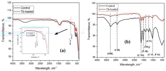 In the spectrum of control for spirulina biomass (Figure 10b), the band at 3280 cm−1 is assigned to the stretching of O-H groups and the one at 2920 and 2851cm−1 to asymmetric C-H stretching. The band at 1640 cm−1 could be assigned to C=O, present in the lipids of A platensis [76]. The strong band at 1541 cm−1 is attributed to the N-H bending of amide groups that are present in cyanobacteria [77]. The shoulder at 1450 and the band at 1390 cm−1 could be assigned to sulfates groups, while the band at 1236 cm−1 is assigned to the C-N vibrations. The band at 1022 cm−1 could be assigned to the C-O stretching of carbohydrates or lipids as well as to the P-O bonds of phosphates groups [78]. In Tb-loaded spirulina biomass, the intensities of the bands corresponding to all function groups have been diminished, which can be associated with the terbium ion binding to functional groups, which results in the occurrence of bond stretching to a lesser degree [79]. Ion-exchange is another possible mechanism of terbium ions adsorption onto spirulina biomass. Thus, it was shown previously that Dy adsorption onto spirulina biomass was accompanied by the decrease in content of Mg, Ca, Cl, and Mn in the biomass [80].