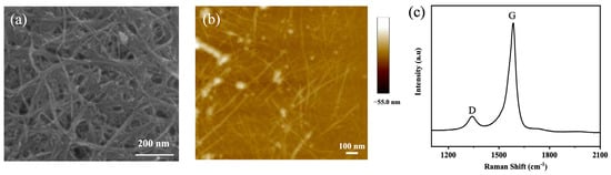 Morphology and Raman spectrum of an obtained SWCNT film. (a) SEM image of the SWCNT film on a SiO2/Si substrate. (b) Zoomed-in AFM image of the SWCNT film. (c) Raman spectrum of the SWCNT film.