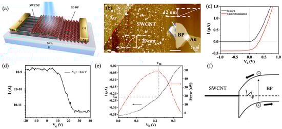 Infrared detectors have been widely studied and applied in both military and civilian fields of detection and communication [,]. The selection of suitable sensitive materials plays a crucial role in determining the performance of infrared detectors. Black phosphorus (BP) and single-walled carbon nanotubes (SWCNTs) are ideal materials for building infrared detectors. BP has a layered structure with a direct bandgap of 0.3–2.0 eV [] and exhibits a high mobility of 20,000 cm2 V−1 s−1 []. This high mobility can enhance the transition efficiency of the carriers under illumination and the switching speed of the devices [,]. The light absorption characteristics of BP shows that BP is a good infrared light-absorbing material [,]. Additionally, BP also exhibits good strength, flexibility, and flame retardation [,]. Similarly, SWCNTs have a direct tunable bandgap that varies with their diameter [,], showing strong photo-absorption range from ultraviolet to infrared [,] and a fast light response capability []. It has a high mobility up to 100,000 cm2 V−1 s−1 and a conductivity of 106 S m−1 [,,]. SWCNTs also exhibit excellent strength and flexibility [,].