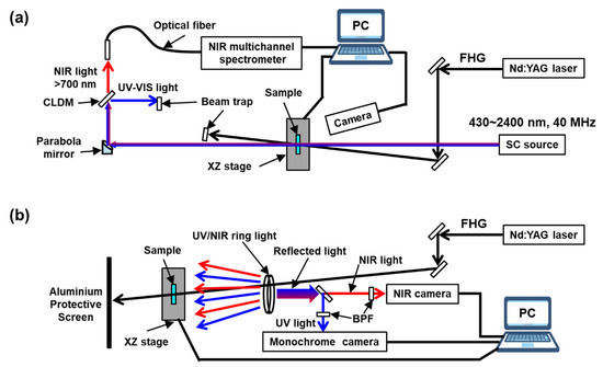 The optical properties were monitored using two methods. Figure 2a,b depict the systems employing a mode-locked supercontinuum source (SC) (SC-Pro-M-40 MHz-PP, YSL Photonics) and a home-made LED ring UV and NIR light, all of which were used as probe lights. To investigate the effect of FHG irradiation, Figure 2a shows the changes in the NIR transmittance, whereas Figure 2b shows the image changes in the UV and NIR diffuse reflectance using two digital cameras. In Figure 2a, the SC light is directed onto the sample surface along the normal direction of the substrate without any focus. A parabolic mirror (MPD169-P01, Thorlabs) and a cold mirror (CLDM-50S, Sigma) were used to observe the transmitted light spectra above 700 nm using a photonic multichannel analyser (C10028-01, Hamamatsu). To obtain two-dimensional images, raster FHG irradiation was performed using motorised transition stages, and the light transmitted through the samples was detected using a biased InGaAs photodiode (DET20C2, Thorlabs) and B2987. For this measurement, the transmitted light was passed through a 1650 nm bandpass filter (BPF). As shown in Figure 2b, a custom-made ring light alternating between 395 nm LED (LED395L, Thorlabs) and 1600 nm LED (LED1600L, Thorlabs) was directed onto the sample to capture diffuse reflectance images using a monochrome CMOS camera (CS165MU, Thorlabs) and an InGaAs NIR camera (XS-USB-FPA-1.7-320-TE0-60 Hz-NTSC-VisNIR, Xenics). The diffuse reflectance of the UV and NIR light was separated using a cold mirror, and spectral separation was further achieved using 390 nm (FB390-10, Thorlabs) and 1600 nm (65794, Edmund Optics) BPFs. Both cameras were simultaneously operated at 10 fps. The FHG and UV/NIR light that were transmitted through the sample were blocked using an aluminium protective screen (TPS5, Thorlabs), installed on the backside of the sample.