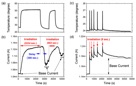 Temporal results of the temperature (top) and current (bottom) of the ITO film under FHG irradiation. (a,b) The results for long-term irradiation. (c,d) The results for short-term irradiation.