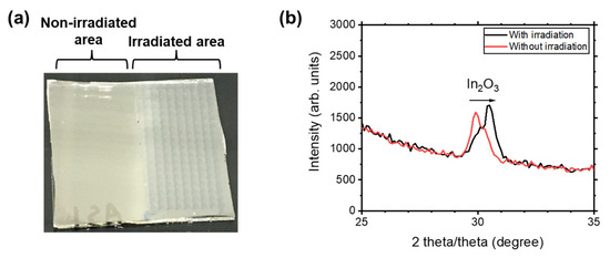 The improvement in the electric properties of the ITO films through FHG irradiation was investigated quantitatively using Hall effect measurements and out-of-plane XRD. For these measurements, the FHG was irradiated on a large area (8 × 17 mm2) of another ITO film on quartz glass by scanning the irradiation; the sample was moved 1 mm at a time and irradiated for 25 s at each spot. The effect of the irradiation is shown in Figure 4a, where the area shows a lamellar texture by achieving a higher transparency. The resistance was 132 ± 20 Ω in the irradiated area, whereas that in the non-irradiated area was 275 ± 12 Ω. The results of the Hall effect measurements are summarised in Table 1. The electrical resistivity was improved from 5.25 × 10−4 Ωcm to 2.73 × 10−4 Ωcm, confirming the improvement in the electrical property of the ITO film via FHG irradiation, similar to ELI [35].