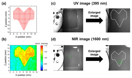 To address these limitations, a real-time imaging system was constructed to observe the optical property changes in the ICO:H films induced by FHG irradiation using UV (395 nm) and NIR (1600 nm) LEDs as light sources and two cameras as detectors, as shown in Figure 2b. To test the system, we used an ICO:H/glass sample that was initially irradiated with FHG under conditions programmed for the XZ stages, as illustrated in Figure 8a, with a rat-shaped configuration, which was confirmed by acquiring an image of the transmittance using SC light (Figure 8d), as explained in Section 3.2.1. Using this sample, we present the UV and NIR images of the ICO:H/glass system captured with the developed camera system in Figure 8c,d, respectively. The 3 cm square sample substrate was affixed to the XZ stage using a metal plate. Both the UV image (Figure 8c) and NIR image (Figure 8d) depict the rat-shaped pattern that can be observed in Figure 8b. The NIR image exhibited a sharper contrast for the pattern than the UV image. This difference was consistent with the transmittance changes before and after laser irradiation in the UV and IR regions, as shown in Figure 6a.