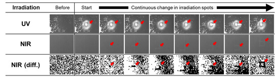 After confirming the distinguishability of light transmittance changes in the ICO:H films induced via FHG irradiation through UV and NIR images, we performed real-time imaging measurements of these variations. Figure 9 shows the temporal UV and NIR images captured during the FHG irradiation of the ICO:H/glass sample (the movie is shown in the Supplementary Materials). Under the FHG irradiation, the profile of the laser light was observed in the UV image, whereas it was absent in the NIR image. When the sample was moved using the XZ stage to trace a square pattern with laser light, the contrast in the NIR image decreased linearly, whereas in the UV image, the FHG light was too intense and impeded the observation of contrast changes. The contrast variations observed in the NIR images are distinctly visible in the differential images. Although the changes in the properties of the ICO:H film induced by the laser light were not discernible in the UV images, they were observable in the NIR images.