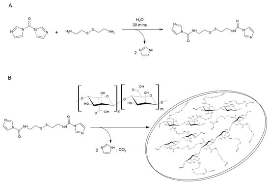 (A) Synthetic scheme of di(N-imidazolyl)carbonylaminoethyl disulphide (cross-linker); (B) Synthetic scheme of sodium alginate microsponges.