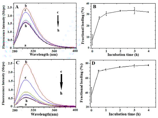 The intrinsic fluorescence of the Tyr residue was also exploited to estimate the loading efficiency of CIG814 on NaAlg PMS through an independent experiment. Peptide solutions were excited at = 270 nm and the spectra recorded between 285 and 400 nm. The emission spectra of supernatant solutions of CIB814 (0.5 mg/mL) and NaAlg PMS (4 and 8 mg) at different times (from t = 0 to t = 4 h) were reported in Figure 5A and Figure 5C, respectively, together with the associated peptide fractional loading (Figure 5B,D), estimated by subtracting the emission intensity at = 307 nm of the supernatant solution measured at each incubation time from 0 to 4 h from that of the initially added peptide (Equation (3)). Raw data of these experiments are reported in the SM (Tables S8 and S9).