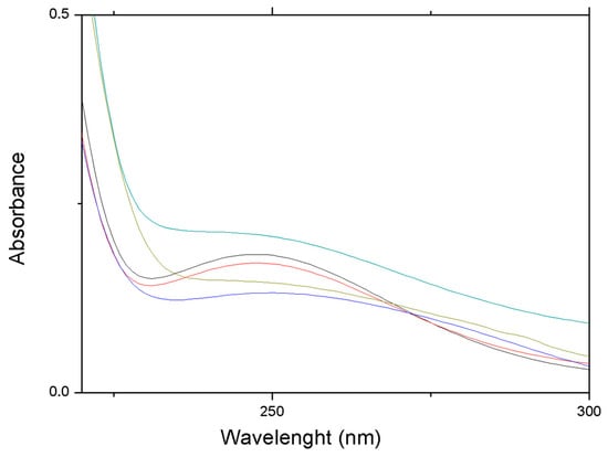 In Figure 6, we reported the absorption spectra of supernatant solutions of NaAlg PMS in PBS (pH = 7.4) measured at different incubation times. The reported spectra are characterized by a weak absorption band that peaked at = 250 nm, associated with the transition characteristic of the disulphide (-S-S-) bond. Interestingly, for supernatant solutions extracted within the first 2 h of incubation time, the absorbance of (-S-S-) transition can be clearly detected, while at longer times, scattered light contributions markedly affect the measured spectral features. This effect can also be observed in the UV–Vis absorption spectra of NaAlg PMS loaded with CIGB814, where the absorption of the Tyr group = 270 nm) partially overlapped the disulphide absorption band (Figure S10). The results shown in Figure 5 and Figure S9 indicate that the NaAlg PMS, under the applied conditions of the peptide release experiments, are subjected to partial degradation, dissolving small PMS and/or PMS fragments in the PBS solution. This effect clearly increases the porosity of the polymer matrix and promotes the release of the loaded peptide [28].