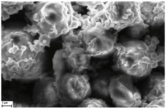 A SEM image of NaAlg PMS (4 mg) loaded with 0.5 mg CIGB814 (incubation time 2 h) is shown in Figure 9. It should be noted that, as the SEM experiments are carried out on dehydrated samples, the PMS dimensions provided by these measurements are typically lower than those obtained by optical or fluorescence confocal microscopies.