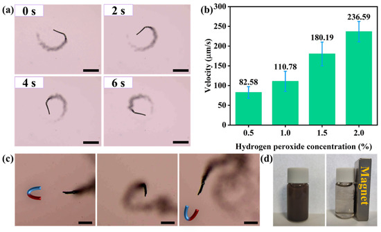 (a) Time-lapse image of the motion of a micromotor in 1 wt% H2O2. Scale bars are 100 µm. (b) Velocities of micromotors at different H2O2 concentrations. A total of 10 independent experiments were conducted to obtain the average velocity. The error bars represent the standard deviation. (c) Magnetic guidance of a micromotor. Scale bars are 100 µm. (d) Magnetic separation of the MnFe2O4@MnO2@fiber micromotors.